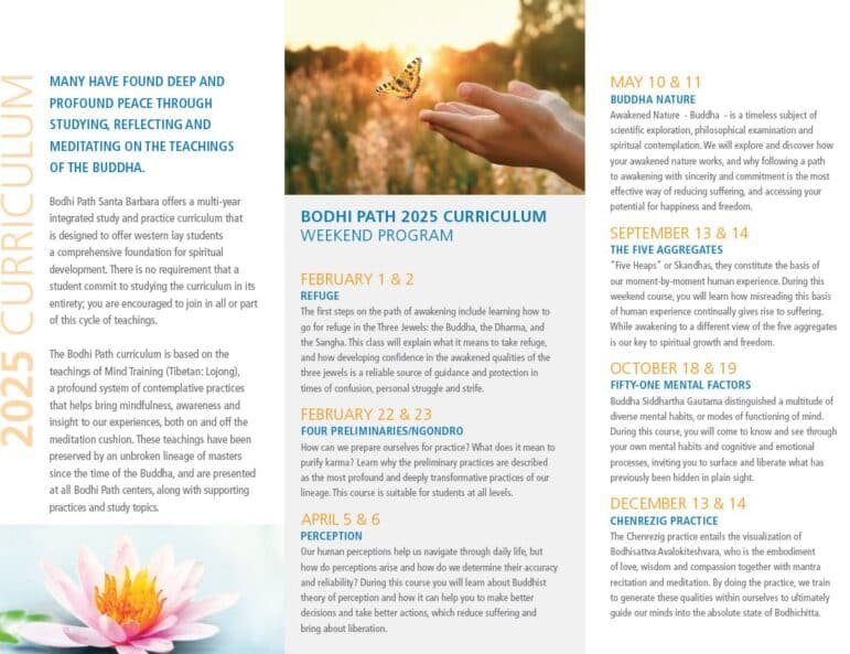 Bodhi Path Santa Barbara offers a multi-year integrated study and practice curriculum that is designed to offer western lay students a comprehensive foundation for spiritual development. There is no requirement that a student commit to studying the curriculum in its entirety; you are encouraged to join in all or part of this cycle of teachings.