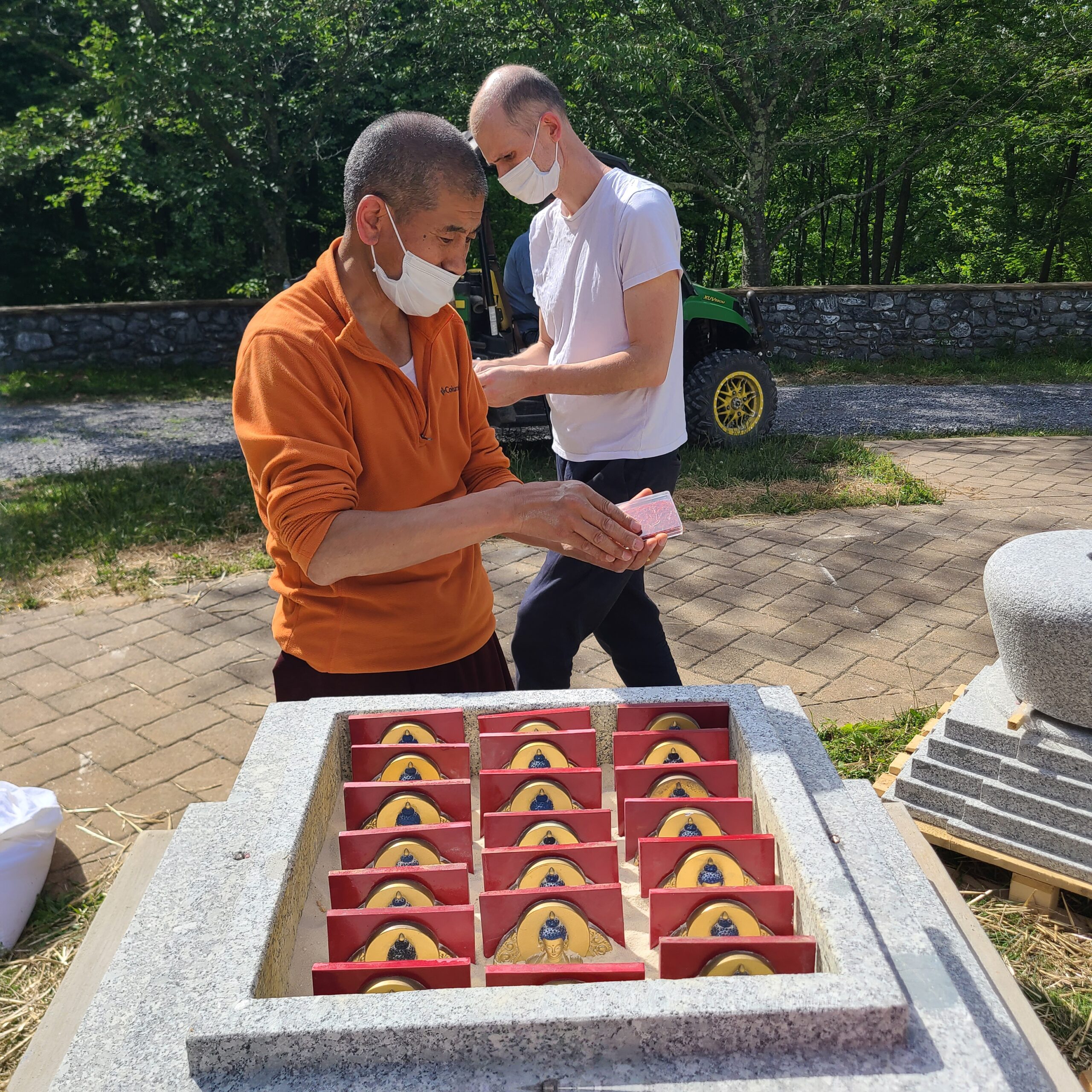 This project was truly global in scope. The granite stone pieces were from a stone quarry and were being carved in Poland. Metal elements were fabricated in Germany and gilded there by an expert in gold application for stupas. Arrangements were made to deliver the elements to the Natural Bridge Retreat Center, where the parts were assembled and the stupas was filled by lamas. The stupa architect worked closely with Karma Trinlay Rinpoche on the stupas’ designs, and then with the artisans to execute their parts of the process.