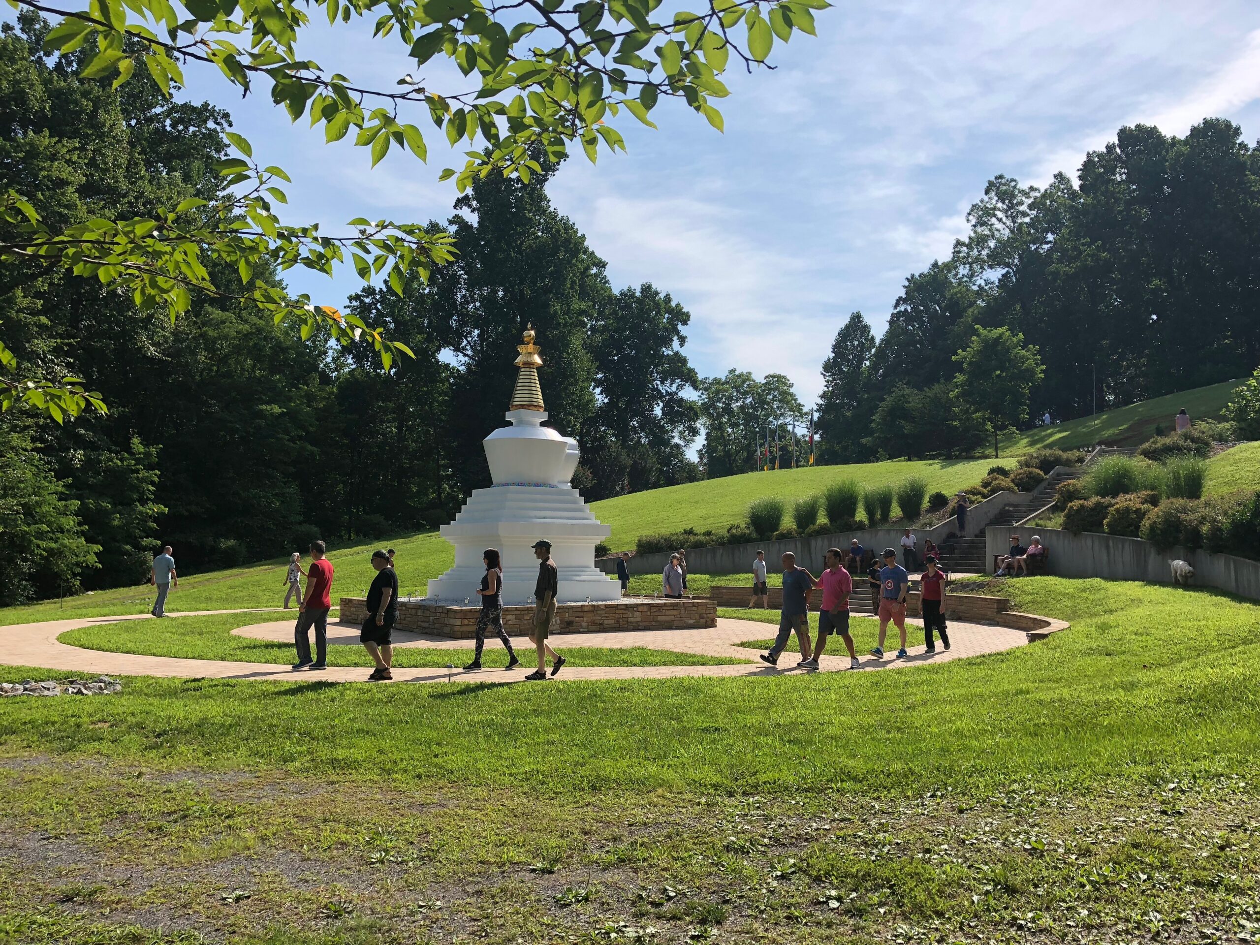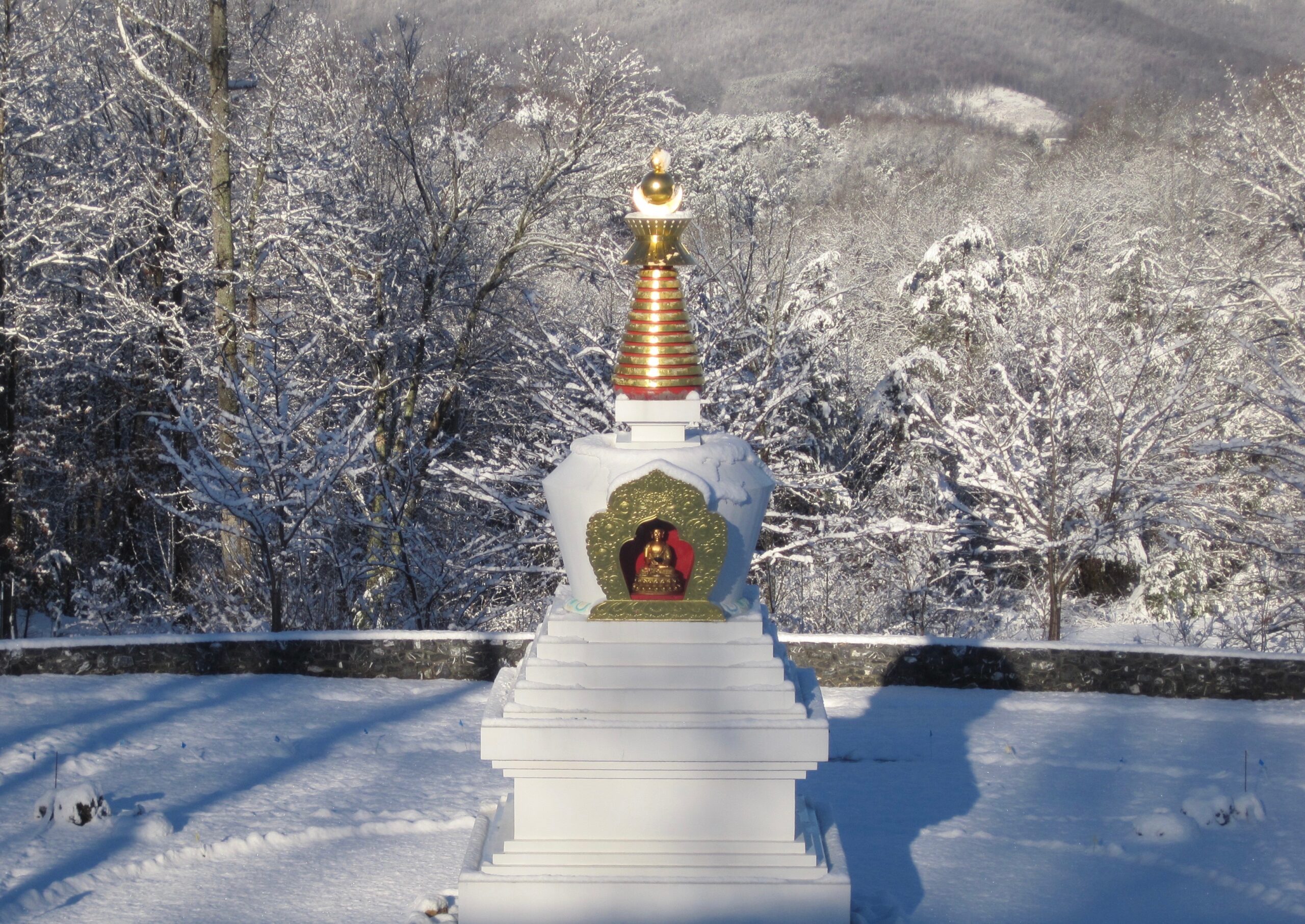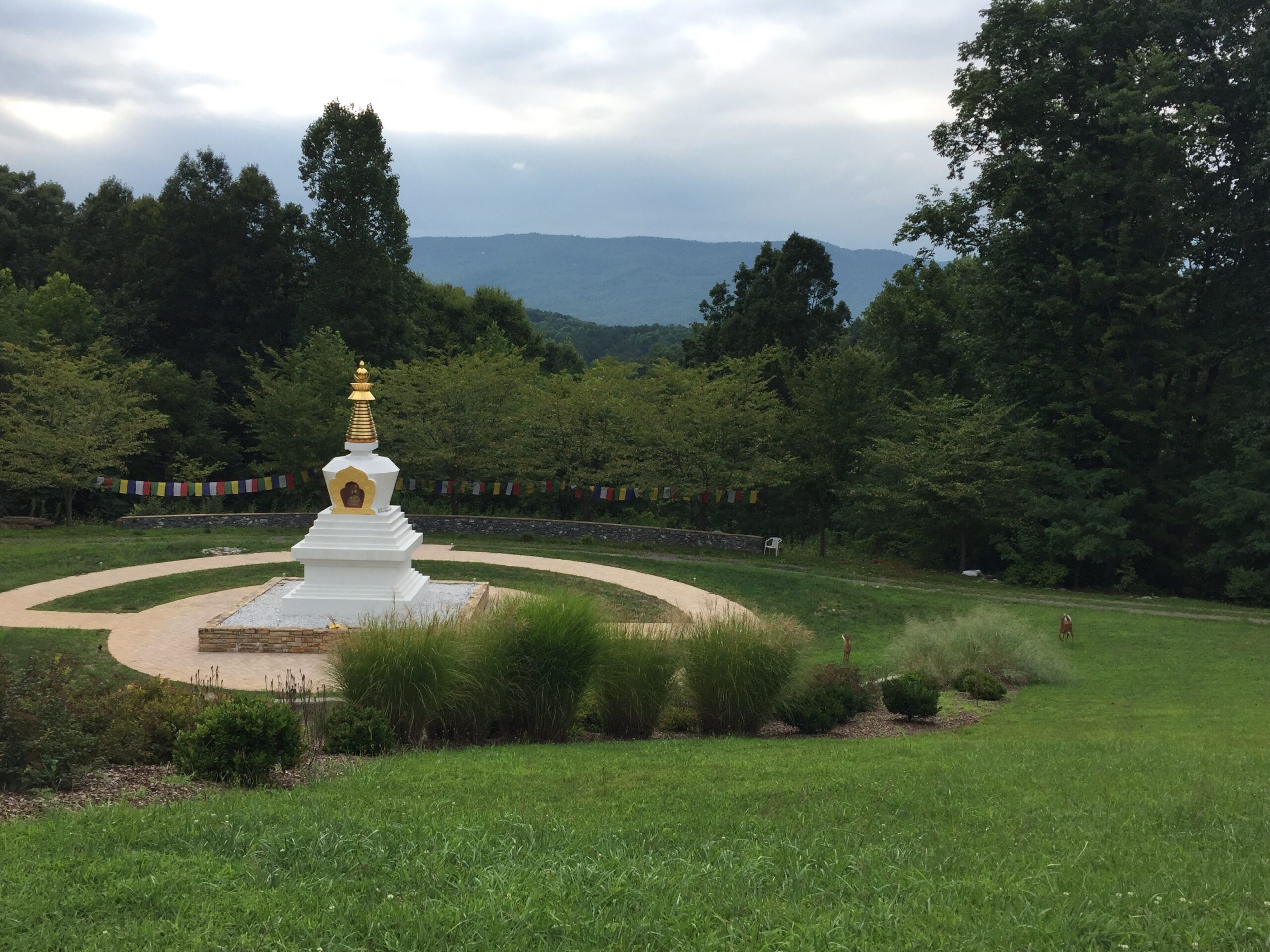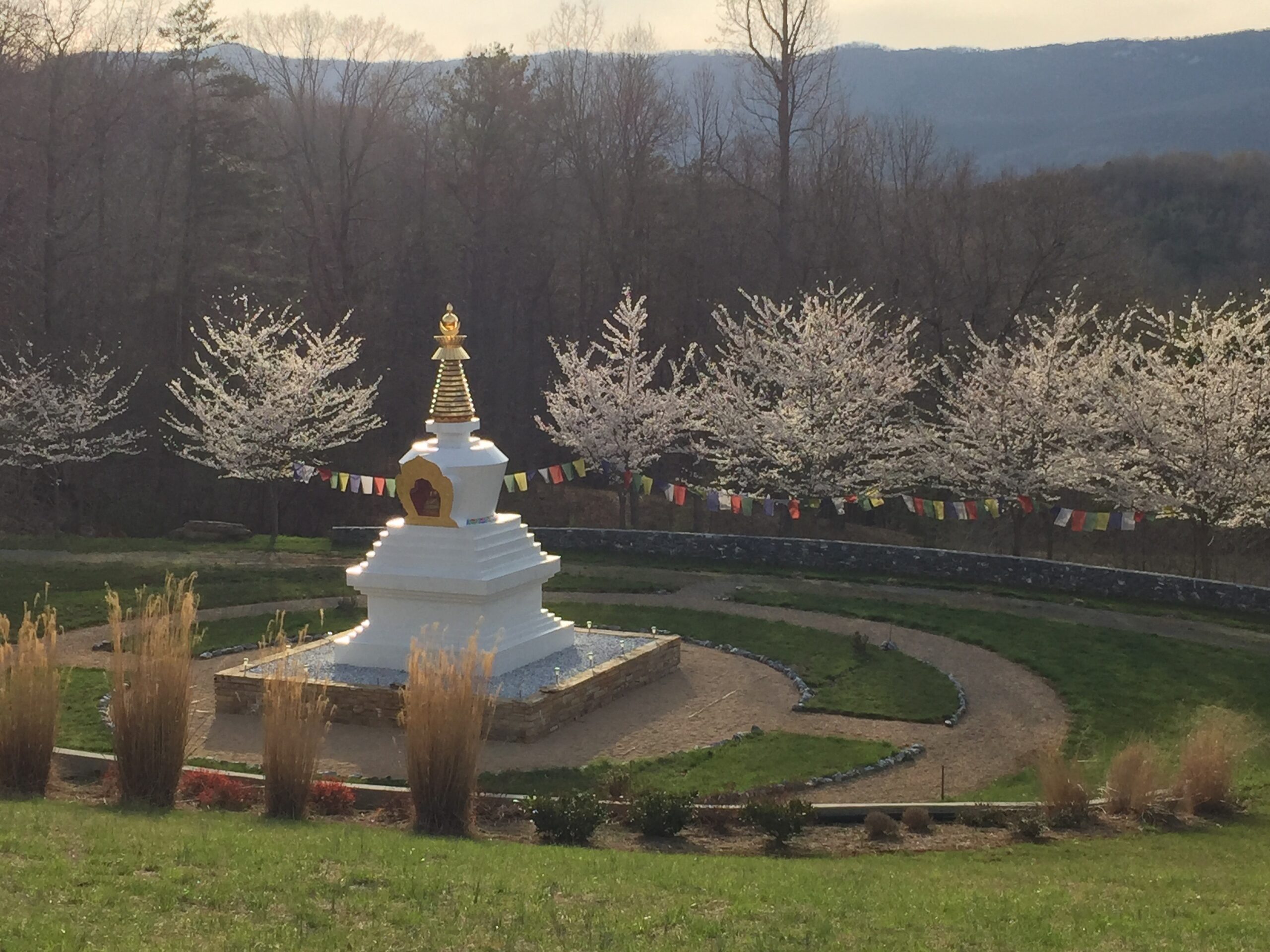 Improvements are ongoing to create a practice environment worthy of the simple beauty and grace of our stupa. The addition and refinement of walkways, benches, traditional Tibetan prayer wheels, and plantings of grass, flowers, and trees will invite visitors to enjoy the stupa and inspire them to find their own best selves by its side. Current fundraising is underway for a project that includes covering the concrete steps with local stone. Click here to read about these enhancements [downloadable PDF].