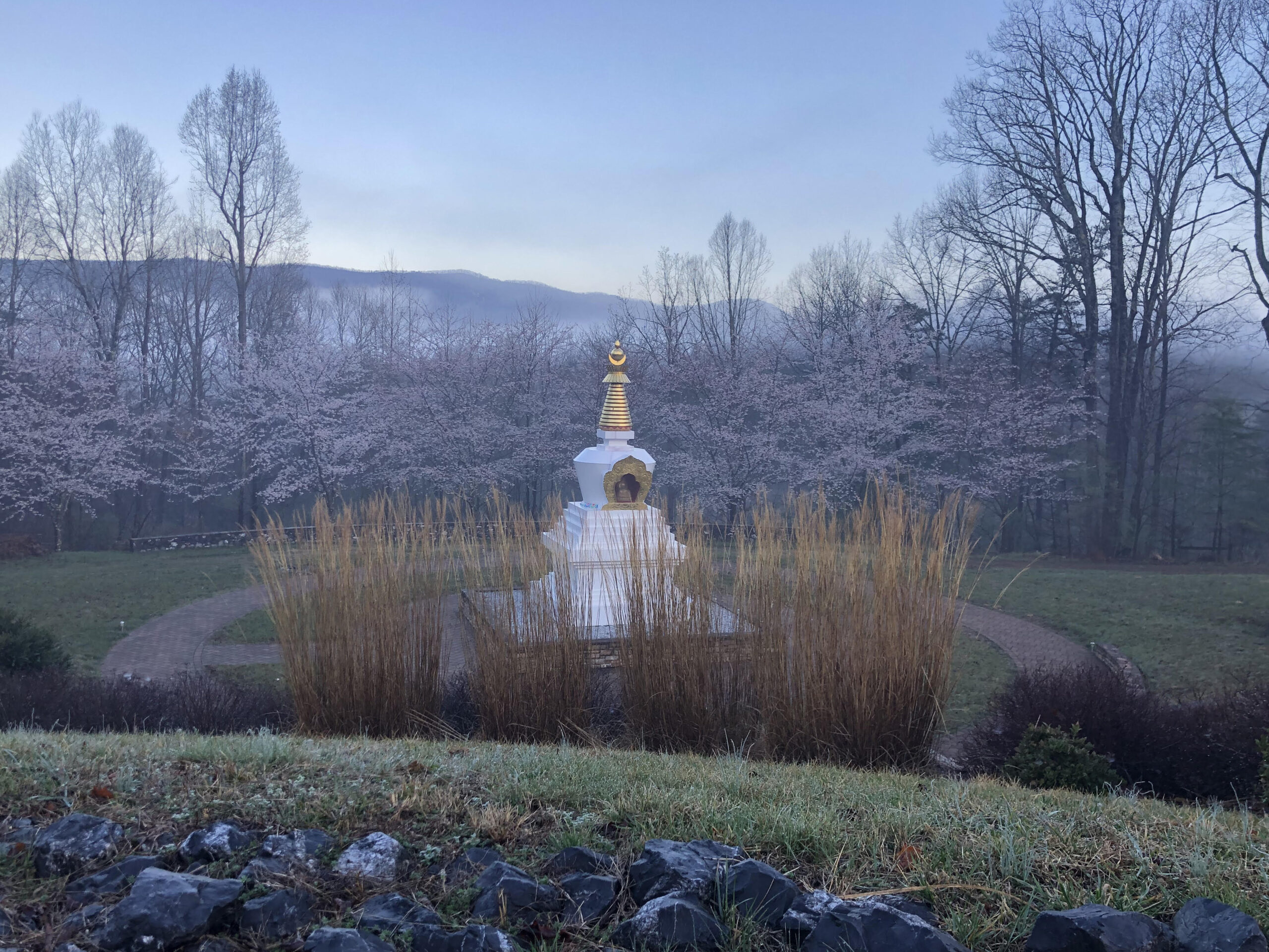 Improvements are ongoing to create a practice environment worthy of the simple beauty and grace of our stupa. The addition and refinement of walkways, benches, traditional Tibetan prayer wheels, and plantings of grass, flowers, and trees will invite visitors to enjoy the stupa and inspire them to find their own best selves by its side. Current fundraising is underway for a project that includes covering the concrete steps with local stone. Click here to read about these enhancements [downloadable PDF].
